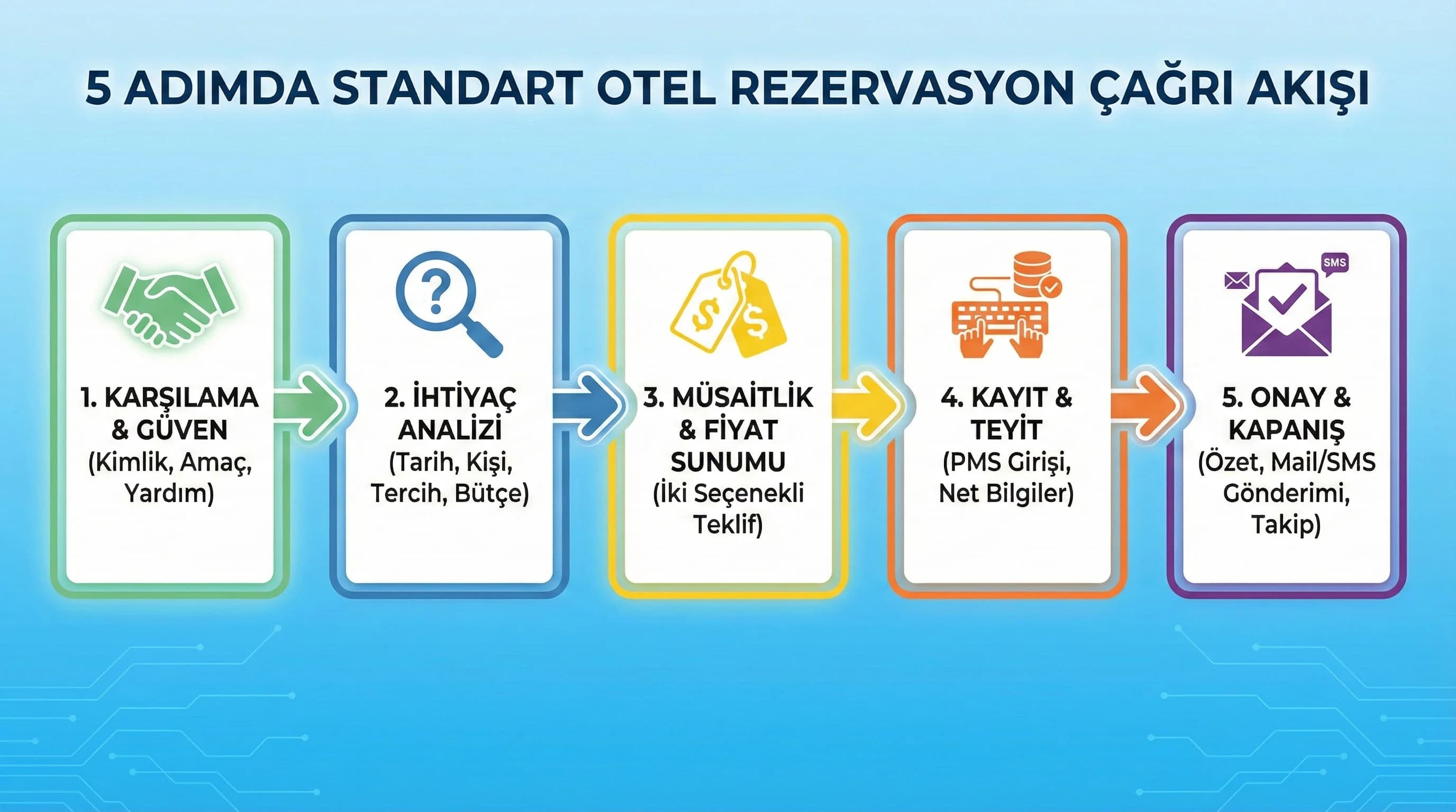Bu bölüm, misafirlerin en sık sorduğu “rezervasyon çağrı akışı nasıl olmalı?” sorusuna hızlı ve uygulanabilir bir standart verir. Akışın temel mantığı şudur: önce güven ve netlik, sonra ihtiyaç analizi, sonra teklif, sonra kayıt ve onay.