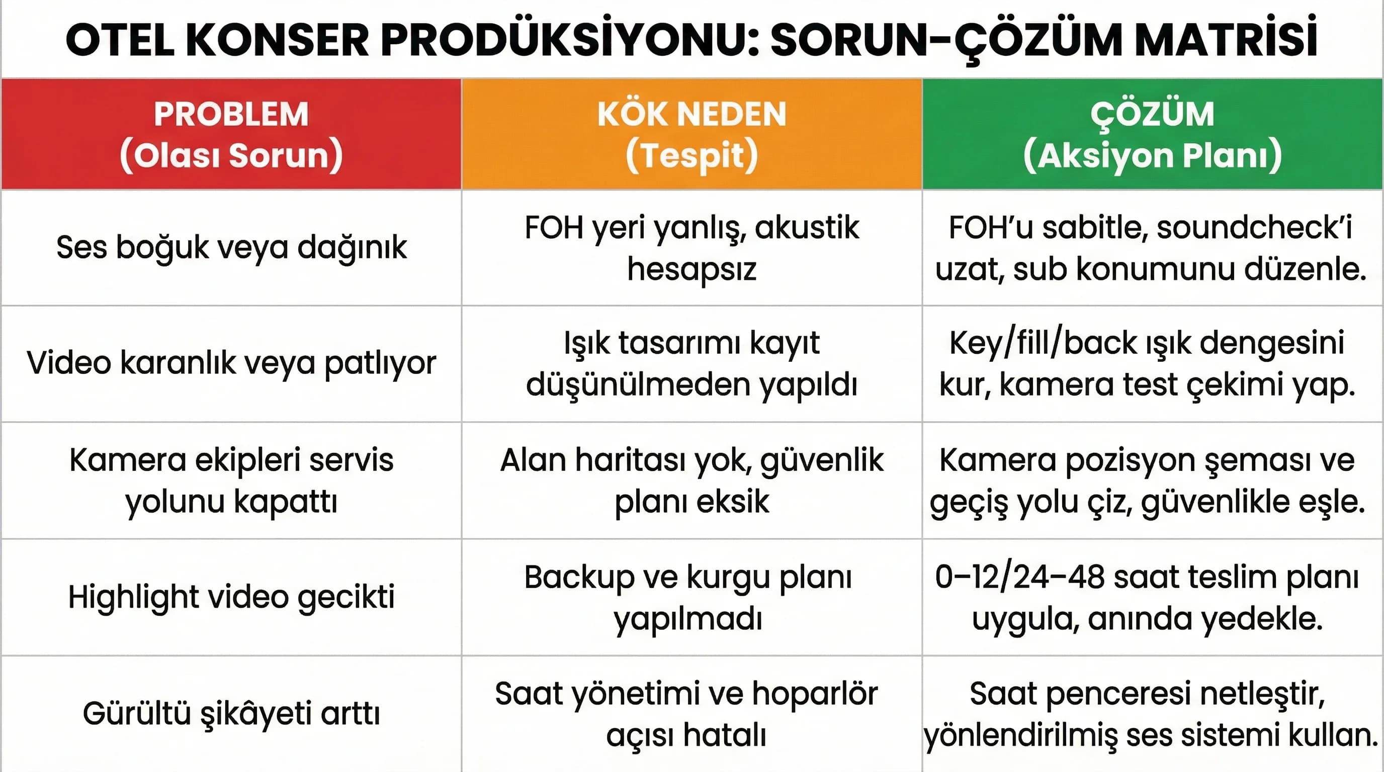 - • Brief + KPI’ı tek sayfaya indir. 2) Mekanı seç ve akustik/gürültü risklerini yaz. 3) Sahne–ses–ışık/backline listeni kilitle. 4) Çekim planını (kamera + kayıt) önceden prova et. 5) Highlight/Reel teslim takvimini prodüksiyonla aynı anda planla.