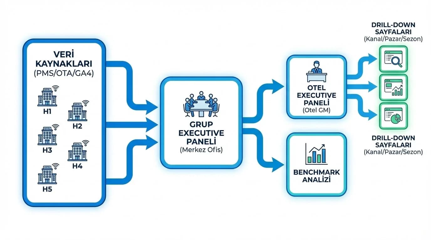 Çok otelli mimariyi 4 parçayla kurun: (1) Property bazlı veri yapısı ve ortak sözlük, (2) üstte grup KPI özet dashboard’u, (3) altta otel bazlı drill-down dashboard katmanları, (4) rol bazlı erişim ve filtre/view kurgusu. Böylece hem grup toplam performansı tek ekranda görünür olur, hem de her otelin detayına kontrollü şekilde inilir.