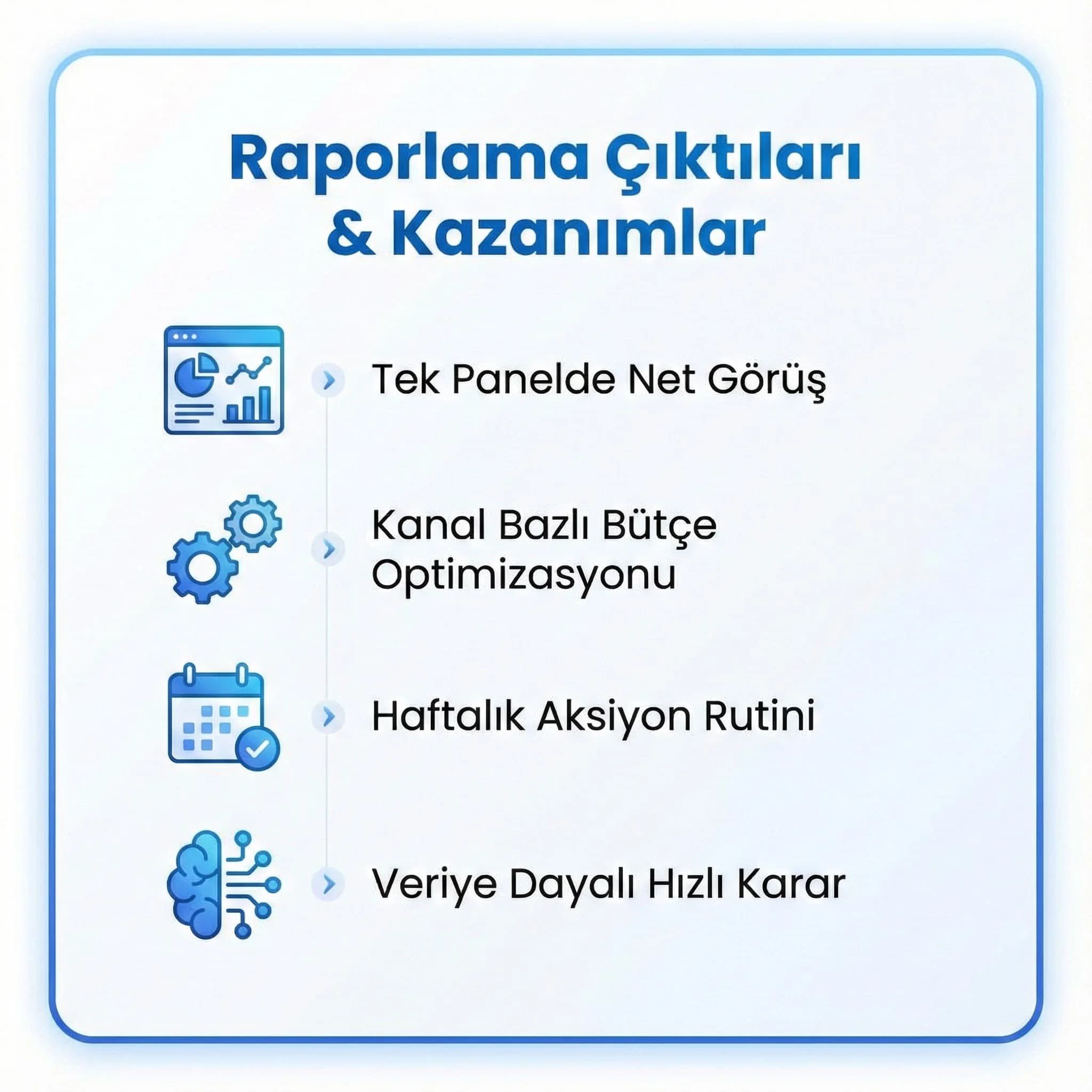 - “Kampanya Sağlığı” Sayfası: Ads kampanya bazlı ROAS/CPA + landing performansı