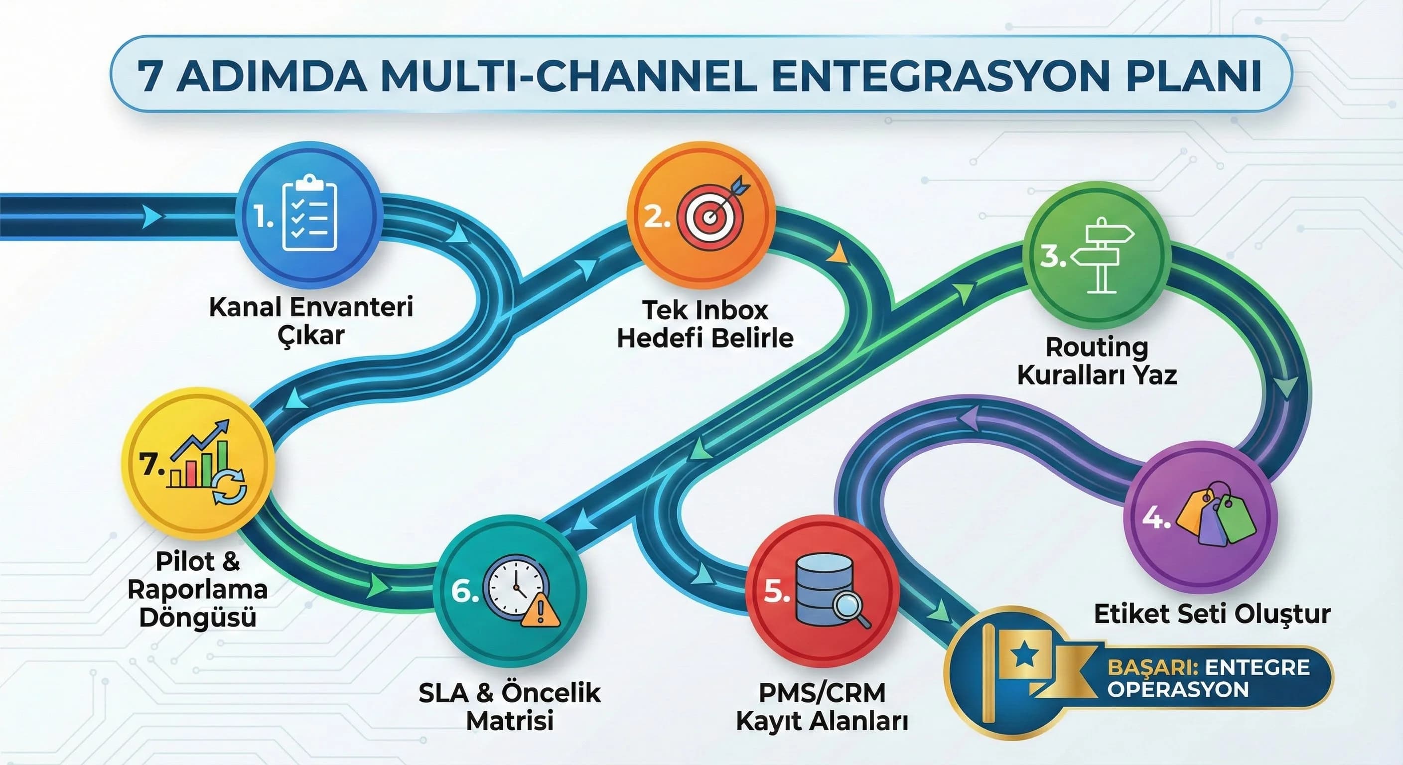 Multi-channel kurulum; kanalları tek kuyrukta toplamak, TR–EN–DE–RU agent’lara doğru yönlendirmek, konuşmaları PMS/CRM’e işlemek ve sezonda kanal önceliklendirme kurallarıyla yönetmekten oluşur. Burada başarıyı belirleyen şey; platform adı değil, operasyon tasarımıdır.