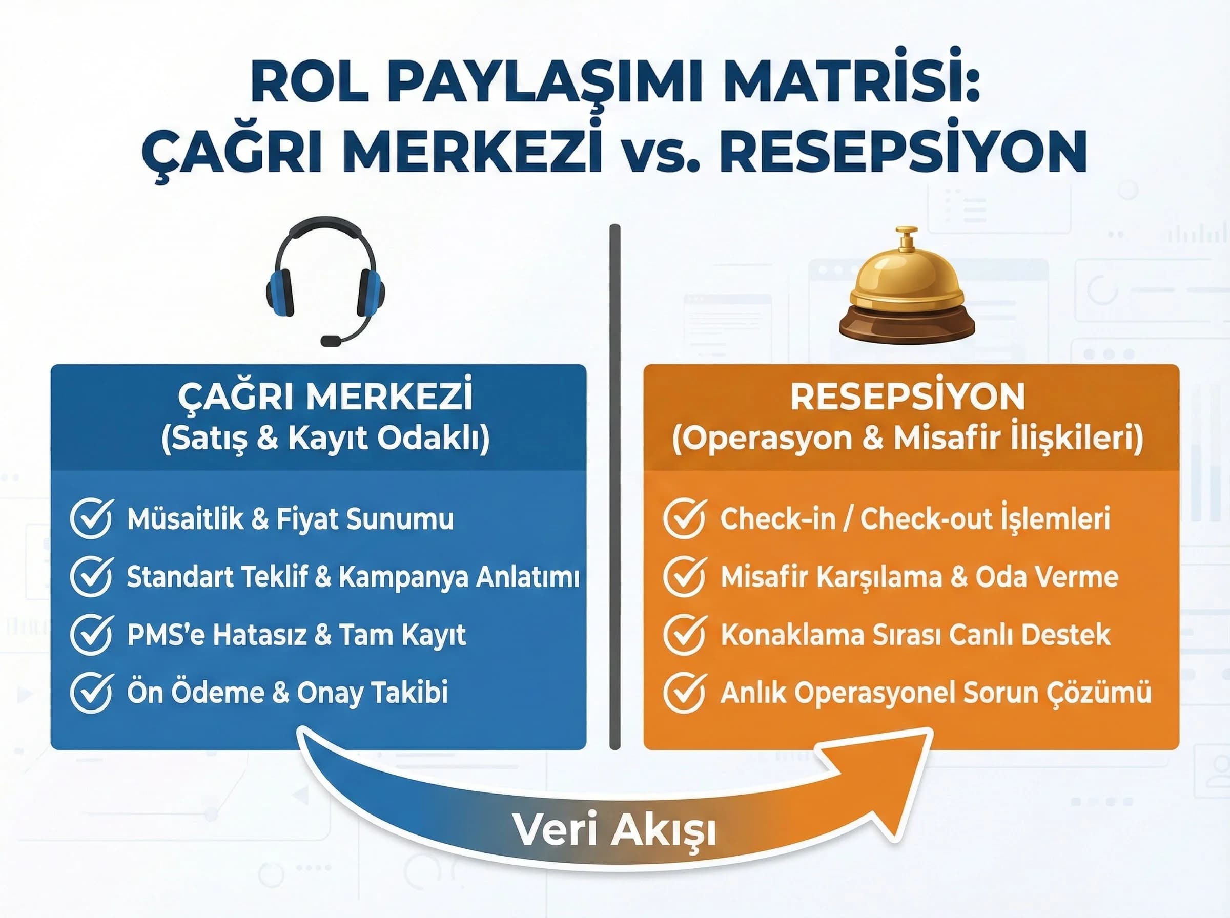 Rakip içerikler çoğu zaman süreci resepsiyon perspektifinden anlatır; oysa dedike rezervasyon hattı, resepsiyonun kritik anlarını korur ve kaliteyi artırır. Rol paylaşımı net değilse iki problem yaşanır: (1) misafir iki farklı kişiden farklı cevap duyar, (2) kayıtlar dağınık olur.