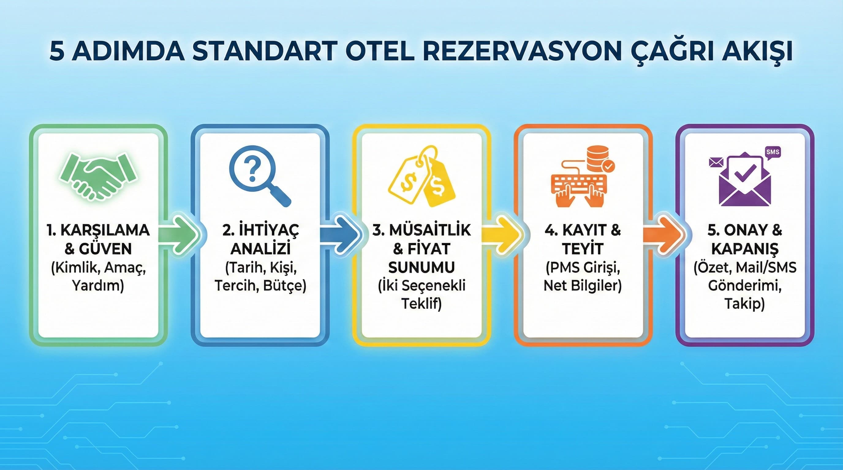 Bu bölüm, misafirlerin en sık sorduğu “rezervasyon çağrı akışı nasıl olmalı?” sorusuna hızlı ve uygulanabilir bir standart verir. Akışın temel mantığı şudur: önce güven ve netlik, sonra ihtiyaç analizi, sonra teklif, sonra kayıt ve onay.