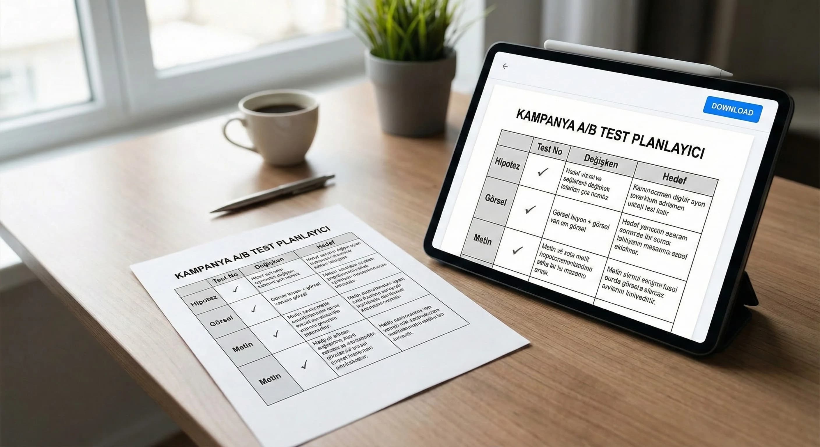 Bu şablon, kampanya kreatiflerini “set + varyasyon + ölçüm” mantığıyla planlamanız için hazırlandı. Mesaj, görsel ve CTA değişkenlerini hipotez bazlı yazdırır; CTR/CVR sonuçlarını tek yerde toplayarak kazanan içgörüyü bir sonraki tasarıma taşımayı kolaylaştırır.