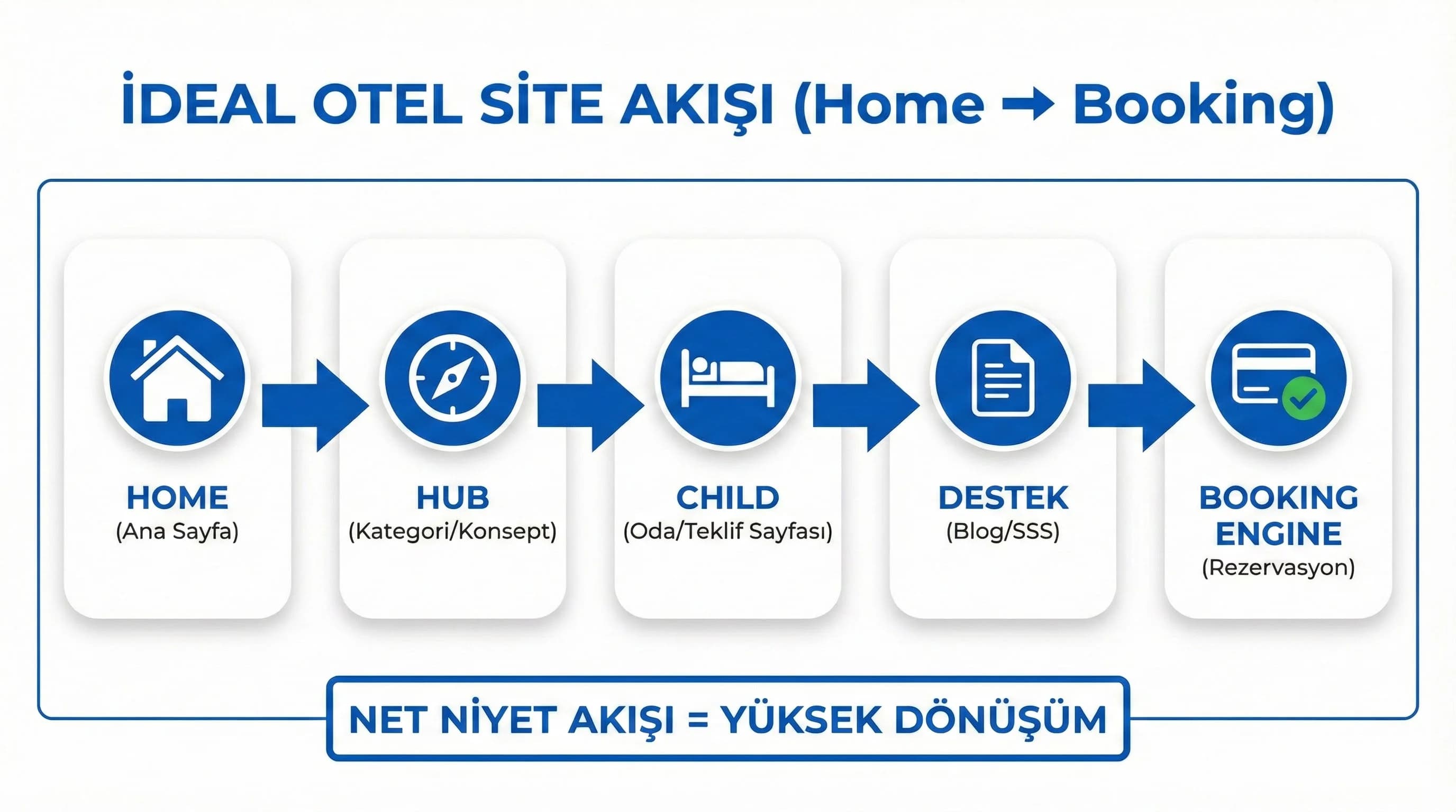 Bu akış, hem Google’a topical authority sağlar hem de kullanıcıyı kararsızlıktan çıkarır. Bir kullanıcı “Belek aile oteli” aradığında önce destinasyon/konsept içeriğiyle gelir, ardından “Family Room” gibi oda sayfasına iner, sonra teklif/rezervasyon adımına geçer. Akış koparsa kullanıcı OTA’ya döner.