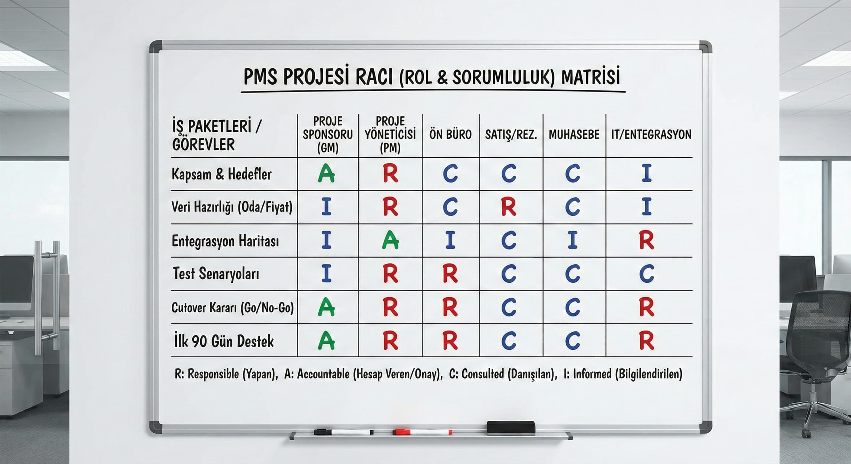 PMS kurulumunda en sık hata “tek kişinin üzerine bırakmak”tır. Başarılı projelerde ekip departmanlar arası kurulur: ön büro ve operasyon iş akışını sahiplenir; satış/gelsin diye değil, veri doğruluğu ve kanal akışını korumak için masadadır; muhasebe rapor ve faturalama kurallarını netleştirir; IT/entegrasyon ise “sistemler konuşsun” diye süreci taşır.