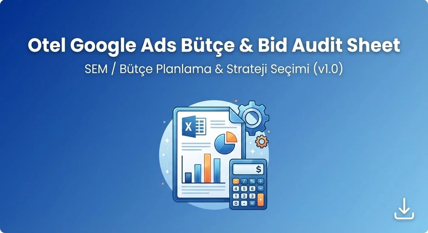 Bu audit sheet; otelinizin Google Ads bütçesini aylık hedef → günlük ortalama (30,4) modeline çevirir, brand/generic/opsiyonel katmanlara dağıtır ve bid stratejisi seçimini “veri olgunluğu”na göre skorlar. Sonuç olarak “ne kadar harcayacağım ve hangi bid ile başlayacağım?” sorusunu tek sayfada netleştirir.