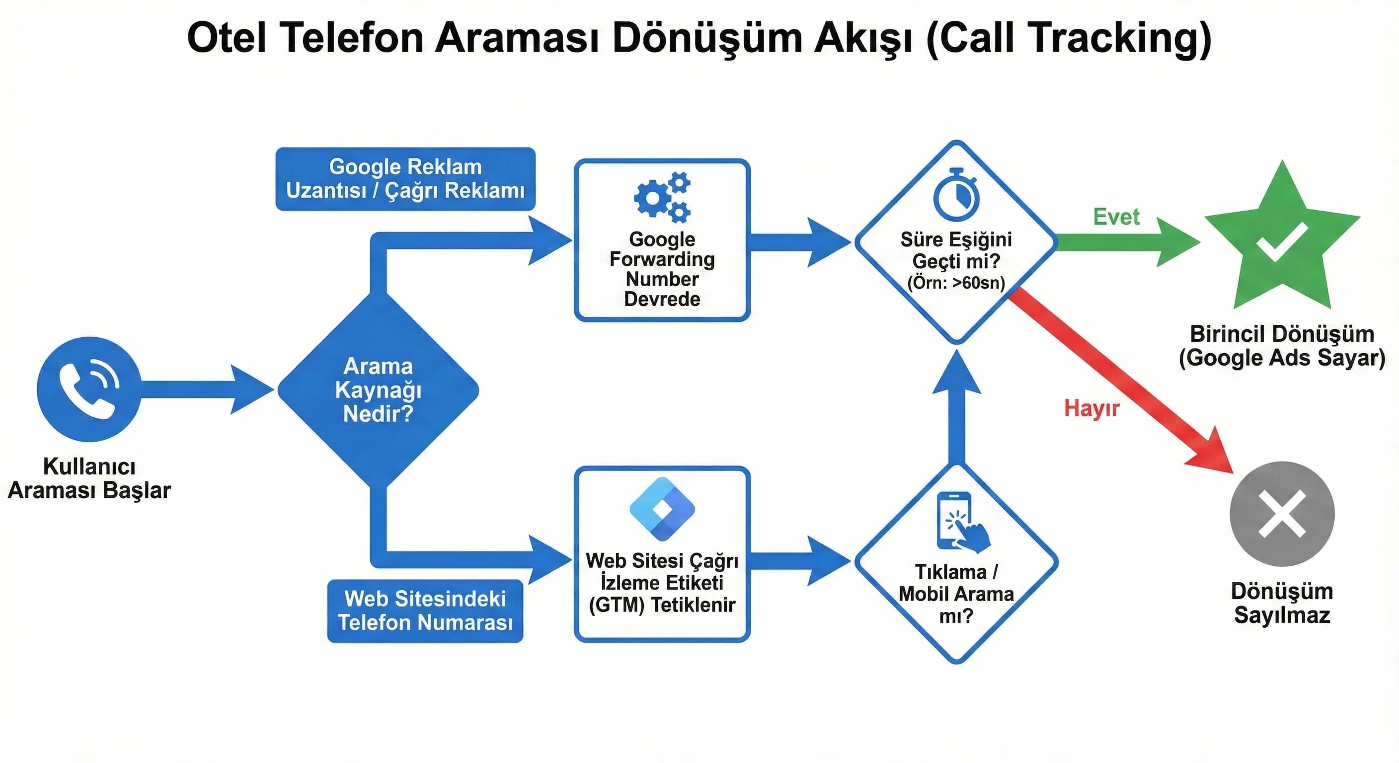 Otel satışında telefon araması çoğu zaman “yüksek niyet”tir. Google Ads, telefon aramalarını dönüşüm olarak ölçmek için farklı seçenekler sunar: ads üzerinden aramalar, call assets/call ads ve web sitesindeki call link tıklamaları gibi.