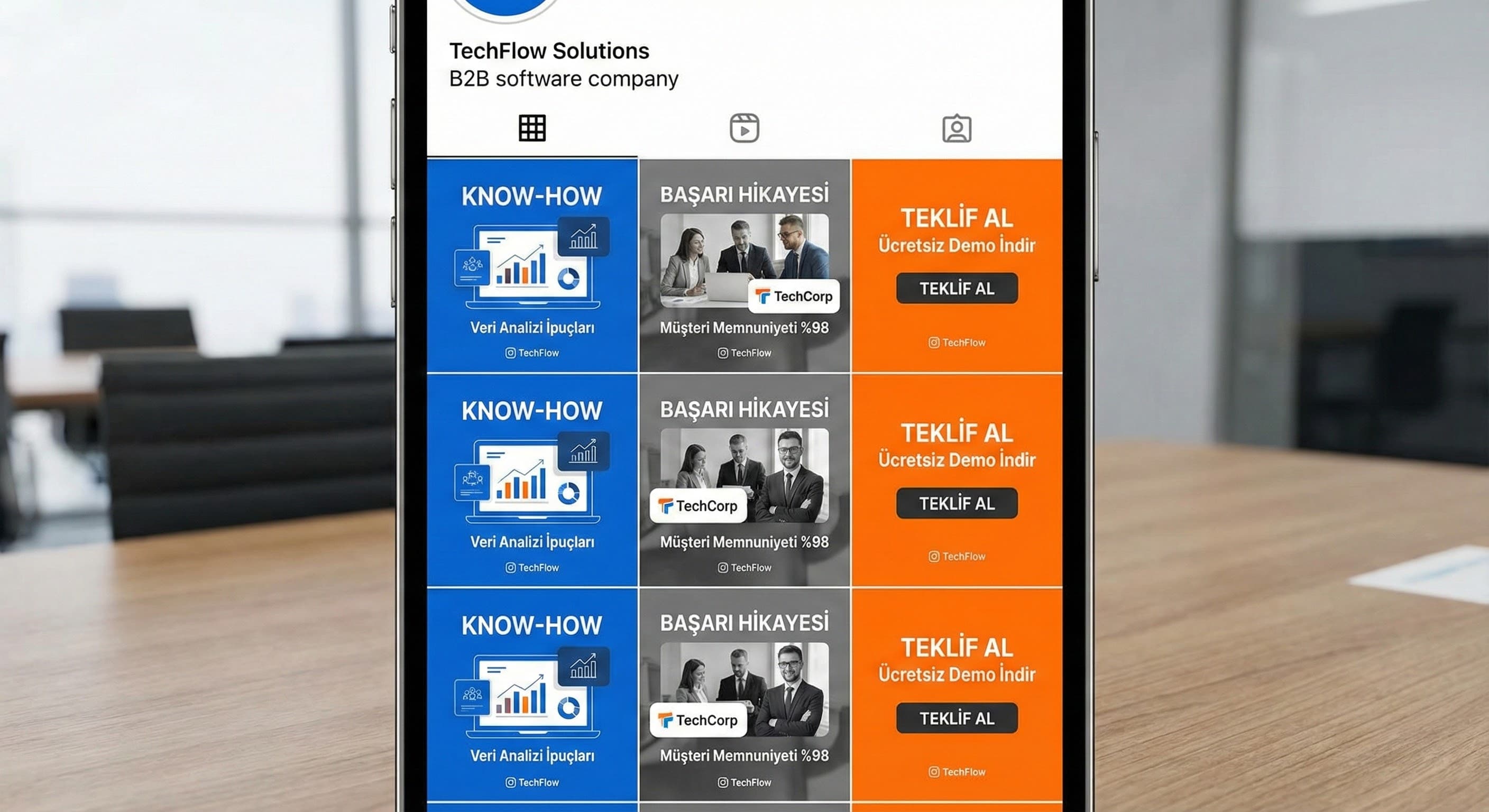 “Grid tasarımı” demek, her postu aynı yapmak değildir. Grid; tekrar eden bir düzen demektir: kullanıcı 9’lu görünümde markayı “okur” ve tanır.