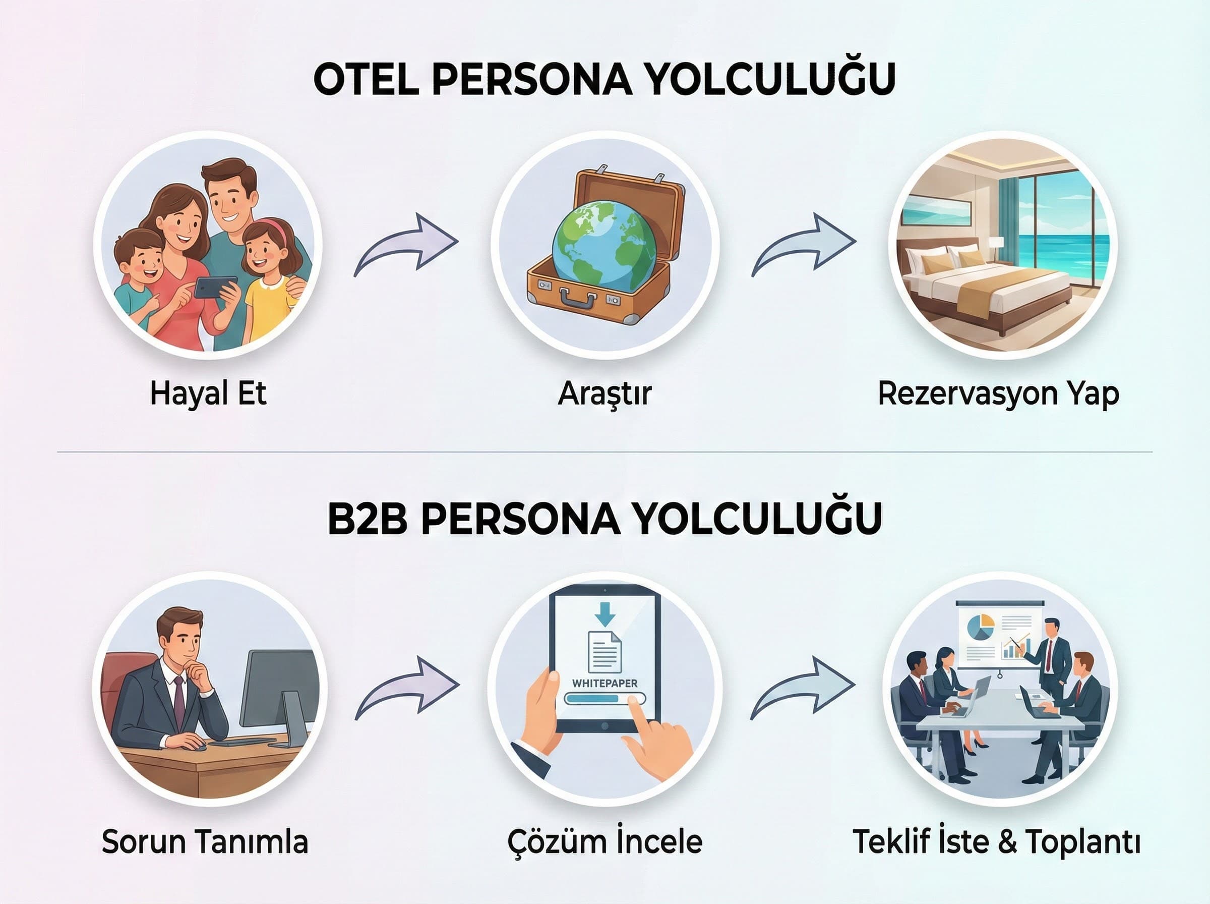 Persona, sadece demografi değildir; ihtiyaç, itiraz, karar kriteri ve içerik tüketim davranışıdır. Otel tarafında persona; yerli/yabancı pazar, aile/çift, sezon ve bütçe gibi parametrelerle değişir. B2B/hizmet tarafında ise persona çoğunlukla “rol temelli”dir: GM, satış-pazarlama müdürü, dijital pazarlama sorumlusu, ajans sahibi gibi.