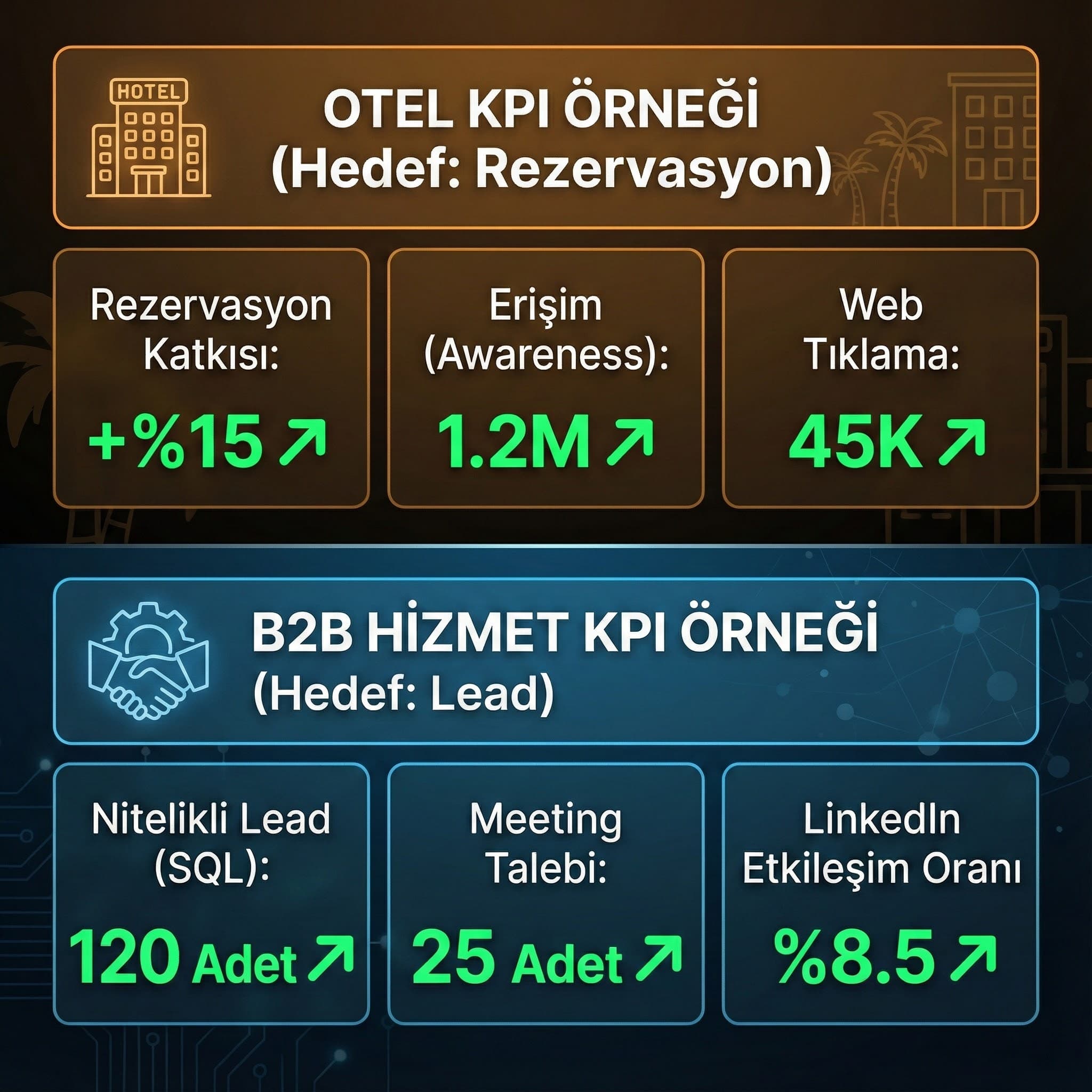 Strateji dokümanının kalbi, hedef ve KPI setidir. “Takipçi artsın” hedef değil, sonuç göstergesi bile olmayabilir. Otel için sosyal medya; rezervasyon, call center, teklif sayfaları ve marka güveniyle birlikte düşünülür. B2B/hizmet tarafında ise satış döngüsü uzun olduğu için KPI seti “mikro dönüşüm → lead → meeting → teklif” zincirinde kurulmalıdır.